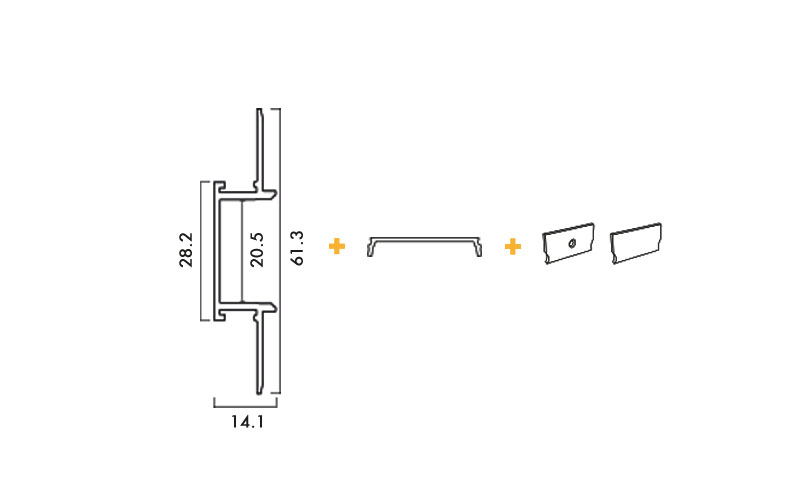 Set per montaggio ad incasso a raso su cartongesso, può alloggiare strip LED IP20 o IP65 (verificare misure ed ingombri effettivi). SET COMPOSTO DA: - Profilo grande a "U" in alluminio estruso anodizzato da 2m - Diffusore opale - 2 tappi
